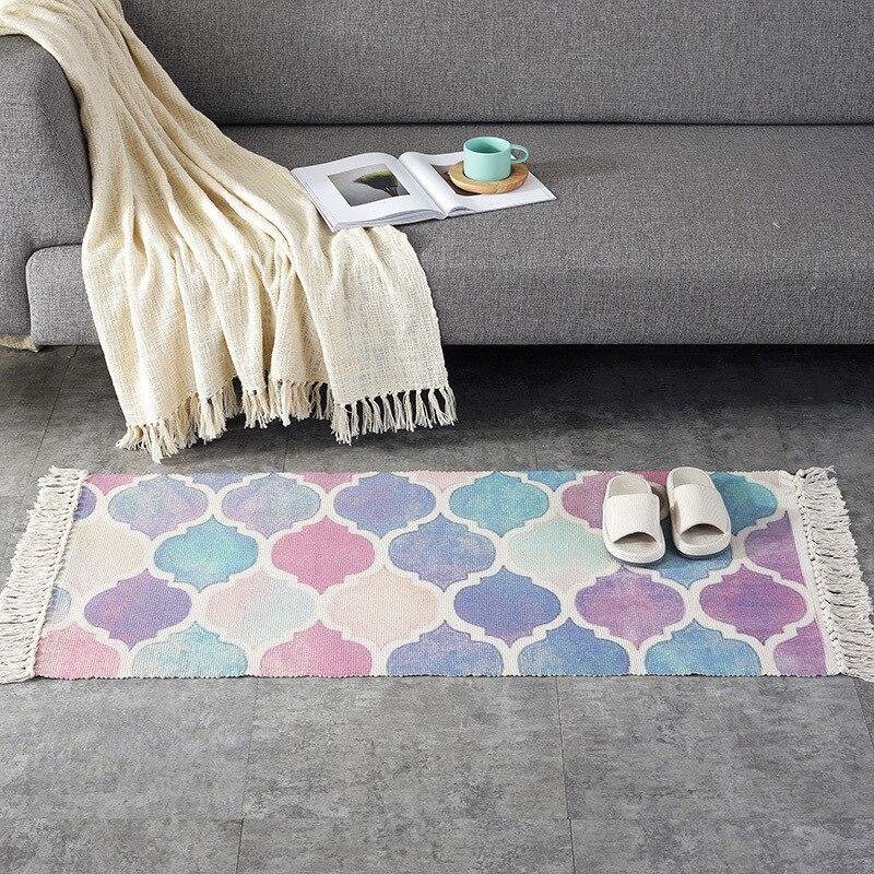 Trænger din stue til et pift af farve og personlighed? Vores smukke og farverige gulvtæppe til stuen er præcis, hvad du har brug for! Dette tæppe er designet til at bringe liv og glæde ind i dit hjem med sit unikke mønster og bløde nuancer af blå, lyserød og lilla. Forestil dig, hvordan dette tæppe vil forvandle din stue til et hyggeligt og indbydende rum, hvor du kan slappe af og nyde hverdagen. Det er ikke bare et tæppe; det er et kunstværk for dit gulv, der inviterer til ro og komfort.