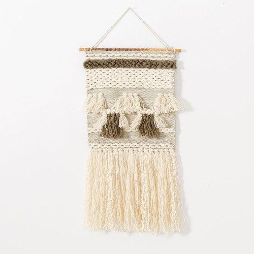 Hvert lille håndvævet vægtæppe til væggen er et vidnesbyrd om omhyggeligt håndværk. De varierende teksturer og mønstre skaber en fængslende visuel interesse, der fanger øjet og inviterer til berøring. De bløde kvaster i cremefarvet og brun tilføjer et legende, men elegant touch, der giver tæppet en unik dybde og bevægelse. Den overordnede konstruktion med forskellige væveteknikker – fra tæt vævede partier til luftige, noprede sektioner – demonstrerer den kærlighed og præcision, der er lagt i hvert eneste stykke. Hæng det op, og mærk, hvordan det transformerer rummet med sin enkle, men sofistikerede æstetik, der både er tidløs og trendy.