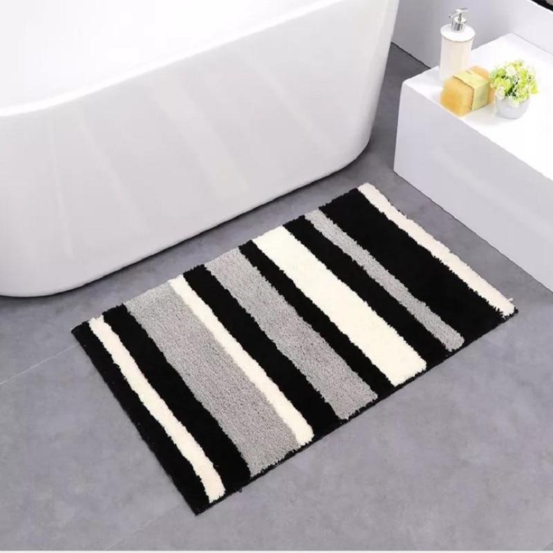 Gør dit badeværelse komplet med en stribet bademåtte i grå og sort
